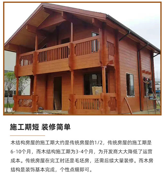 • 木結(jié)構(gòu)房屋的施工期大約是傳統(tǒng)房屋的1/2,傳統(tǒng)房屋的施工期是 6-10個月,而木結(jié)構(gòu)施工期為3-4個月,為開發(fā)商大大降低了運營 成本。傳統(tǒng)房屋在完工時還是毛坯房,還需后續(xù)大量裝修。而木房 結(jié)構(gòu)是裝飾基本完成,個性點綴即可。